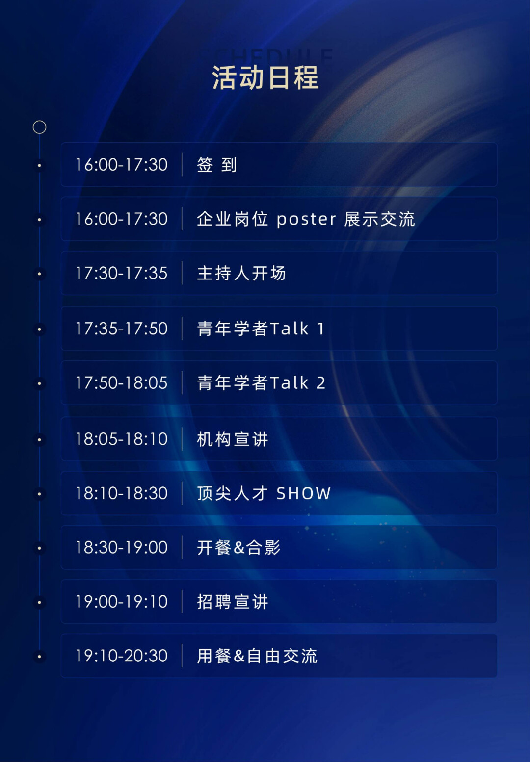 活动拟于维也纳时间 7 月 30 日 16:00-20:30 举行,预计规模 250 人,环节包括青年学者 Talk、顶尖人才 SHOW、互动体验、机构宣讲、企业岗位 poster 展示及晚宴交流,助力人才发展。