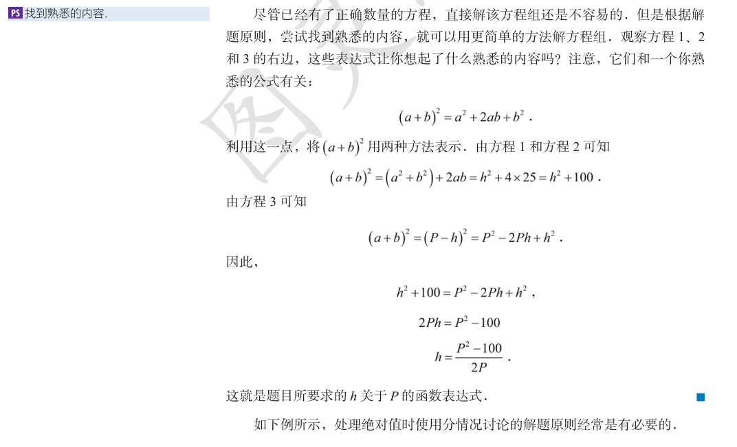 斯图尔特有意识地在各个章节、各类例题(尤其是那些非典型的问题)中反复引用在“解题的基本原则”中介绍的解题策略(如类推、引入额外量、分情况讨论、倒推、设立子目标、归纳等),引导学生不断回忆、识别并主动选择合适的策略。