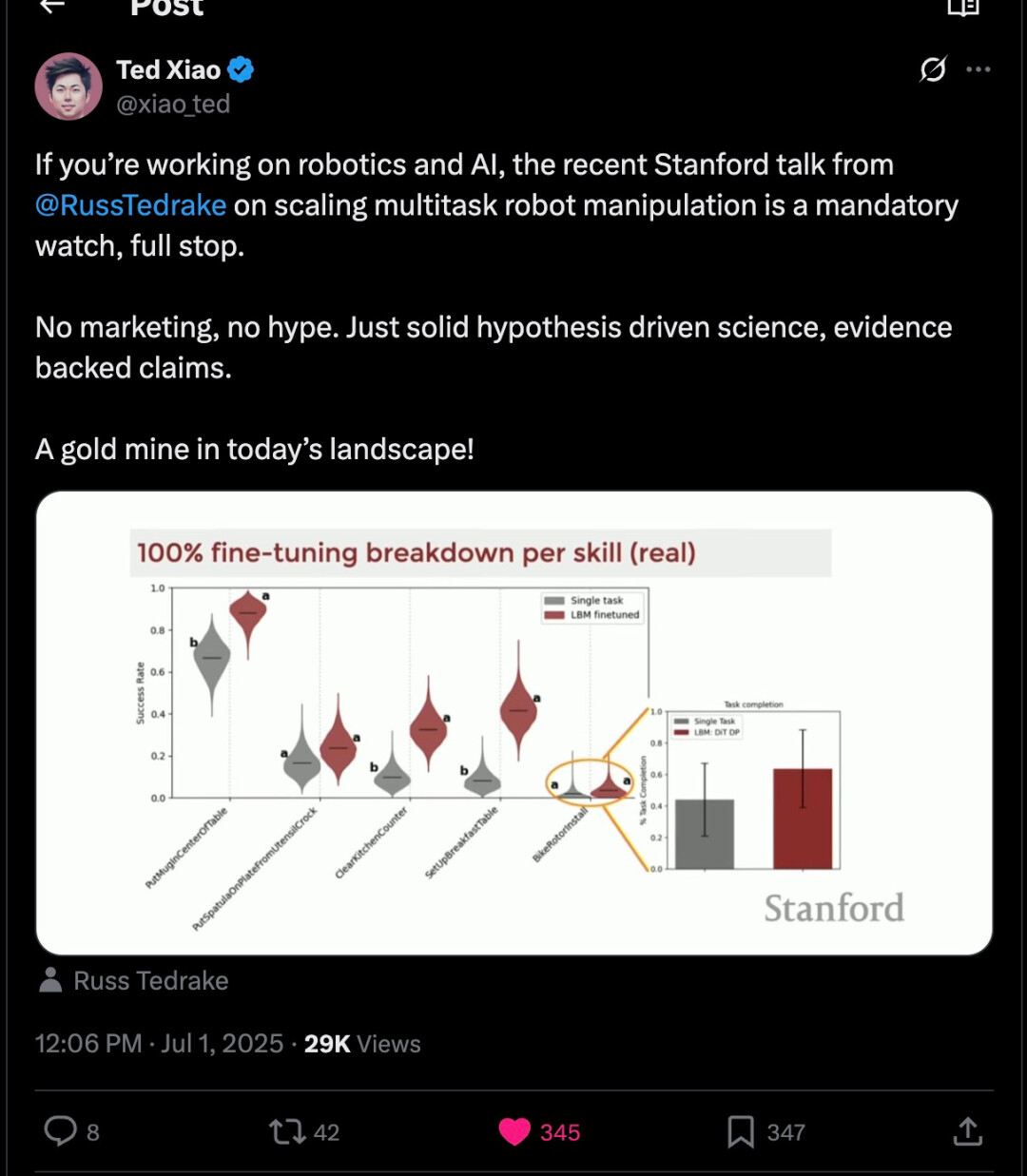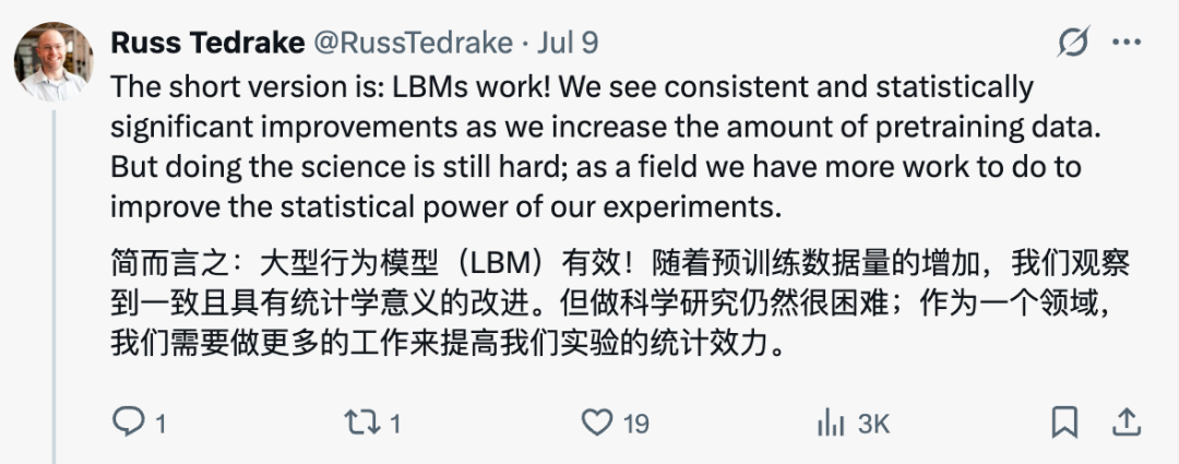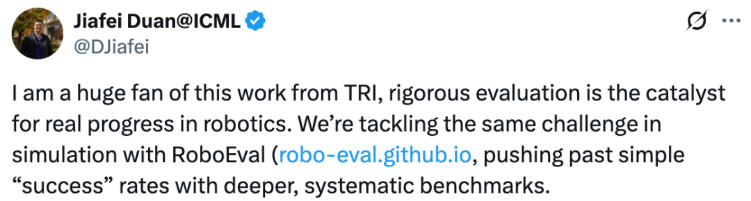 「我是 TRI 这项工作的忠实粉丝,严格的评估是机器人领域真正进步的催化剂。」