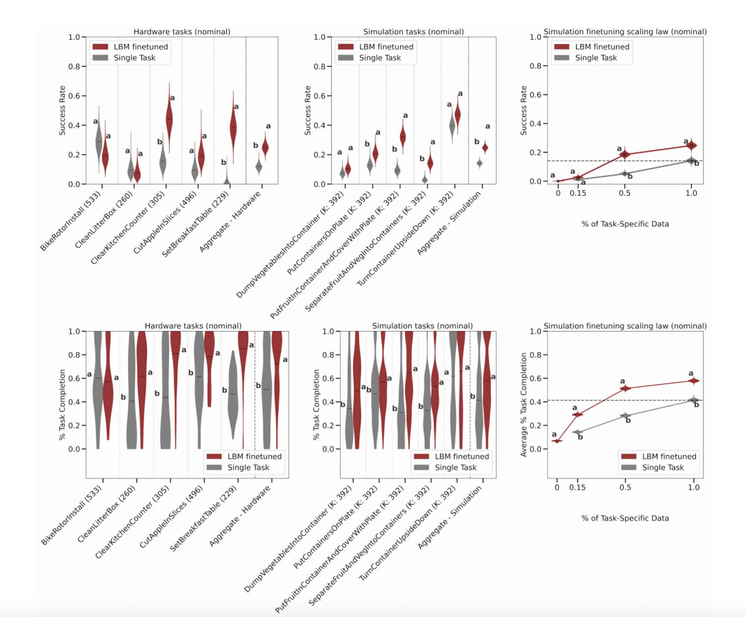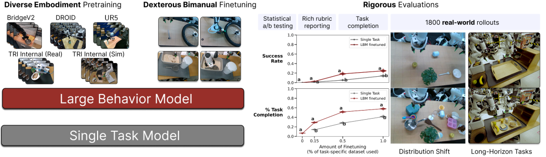 该研究的核心在于,在近1700小时的机器人数据上训练了一系列基于扩散的LBM,并通过1800次真实世界和超过47000次模拟部署进行严格评估。论文设计了细致的评估流程,引入“任务完成度”等指标,确保了结果的统计置信度。实验结果显示,相对于从头开始训练的策略,LBM提供了显著且一致的性能提升,尤其在应对分布偏移的任务时表现出更强的鲁棒性。