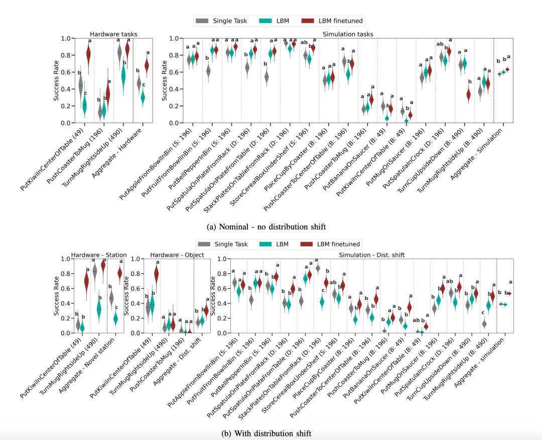 LBM 在真实世界和仿真环境中的「已见任务」表现:(a)无分布偏移,(b)有分布偏移。论文比较了单任务模型、预训练的 LBM 以及微调后的 LBM。