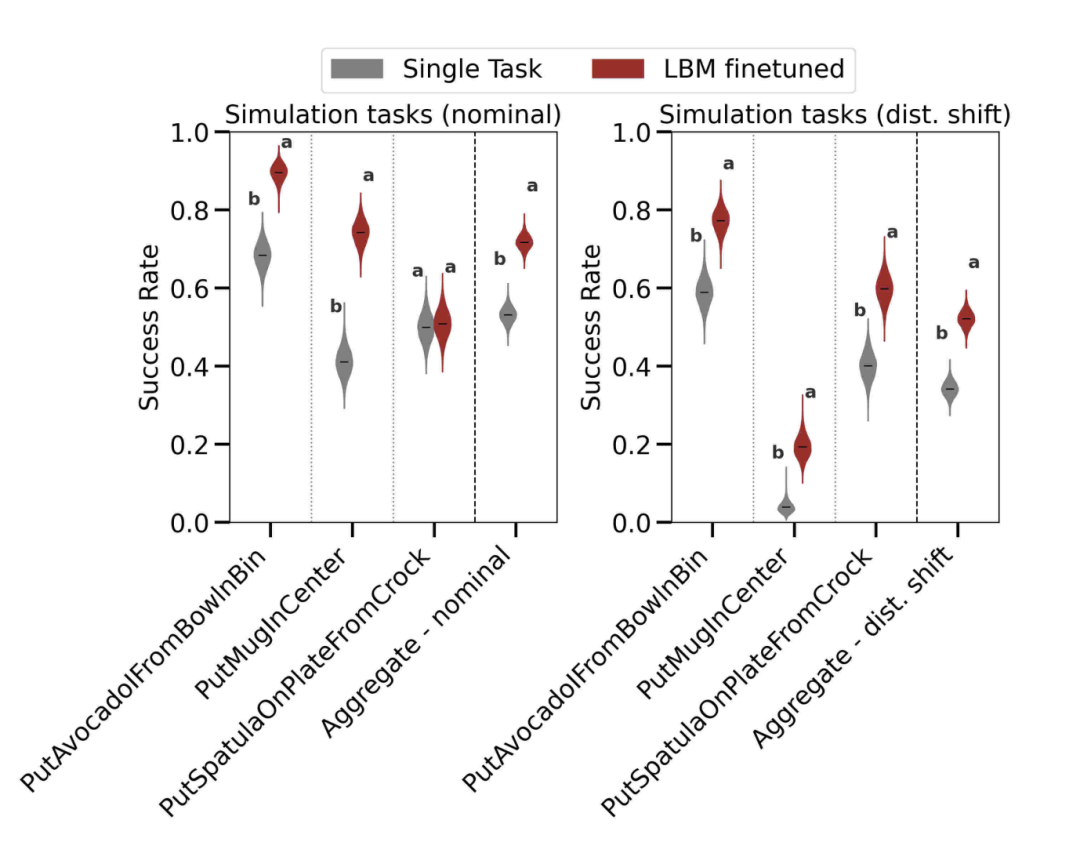 LBM 在来自仿真训练集场景的「未见」仿真任务上的表现。左图:在正常条件下进行评估。右图:在分布偏移条件下进行评估。