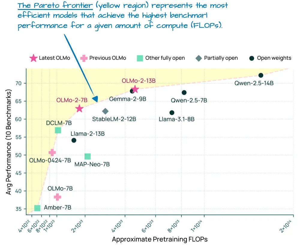 虽然 OLMo 受欢迎主要是因为它的开放性,但它本身表现也不差。事实上,在今年 1 月发布时(也就是 Llama 4、Gemma 3 和 Qwen 3 发布前),OLMo 2 在算力投入与性能之间达到了帕累托最优,如下图所示: