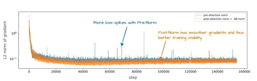 不过需要注意的是,图中效果不仅来自归一化位置变化,还包含了 QK-Norm 的引入,因此无法分辨各自单独的影响。