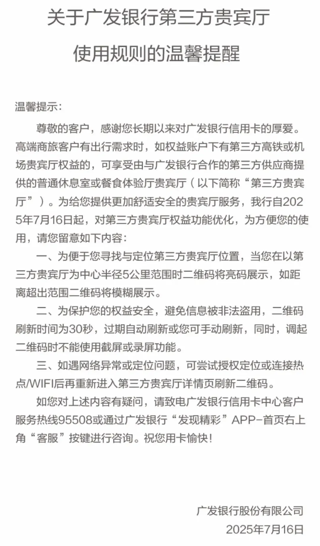广发还对第三方贵宾厅的使用做出了限制,如果不在贵宾厅5公里以内,二维码将模糊展示,理论上杜绝了黄牛交易。