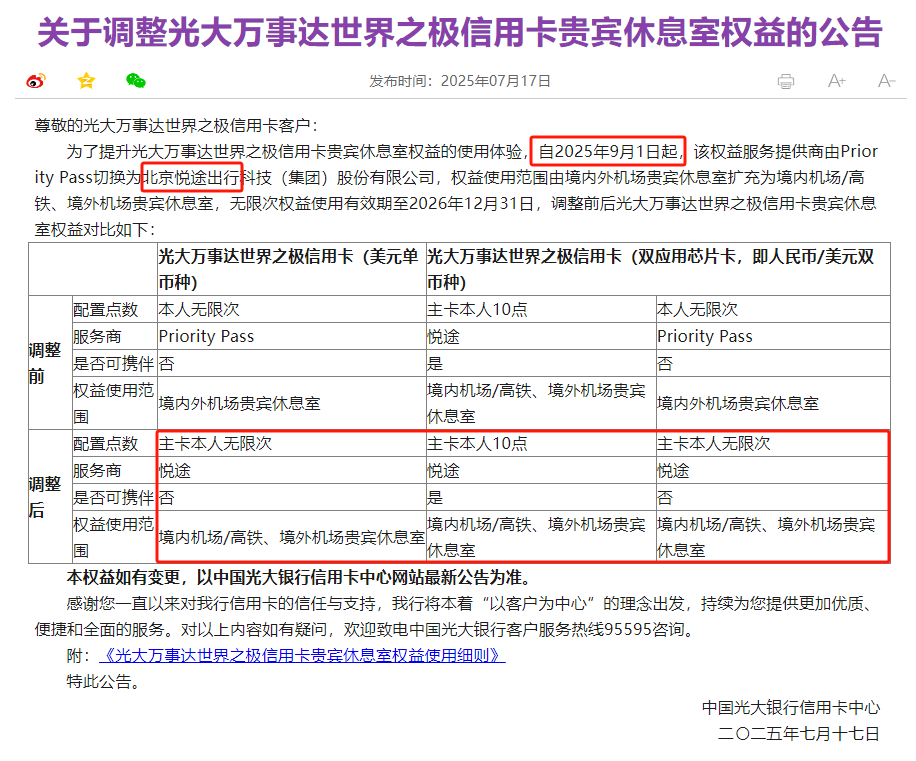 广发光大信用卡贵宾厅服务调整,悦途成新宠,刚性年费制成趋势,使用门槛提高。