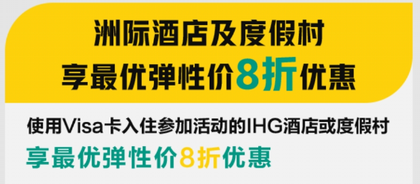 活动内容:Visa持卡人入住以下地区参加活动的IHG酒店或度假村,享最优弹性价8折优惠:新加坡、泰国、越南、韩国、印度尼西亚、马来西亚、菲律宾、马尔代夫、老挝、日本、密克罗尼西亚、澳大利亚、新西兰、南太平洋群岛、中国、香港、台湾、澳门、印度、孟加拉国和尼泊尔。