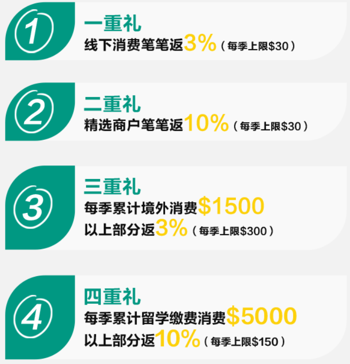 四重礼:季度累计留学缴费5000美元以上部分可返10%,季度上限150美元。