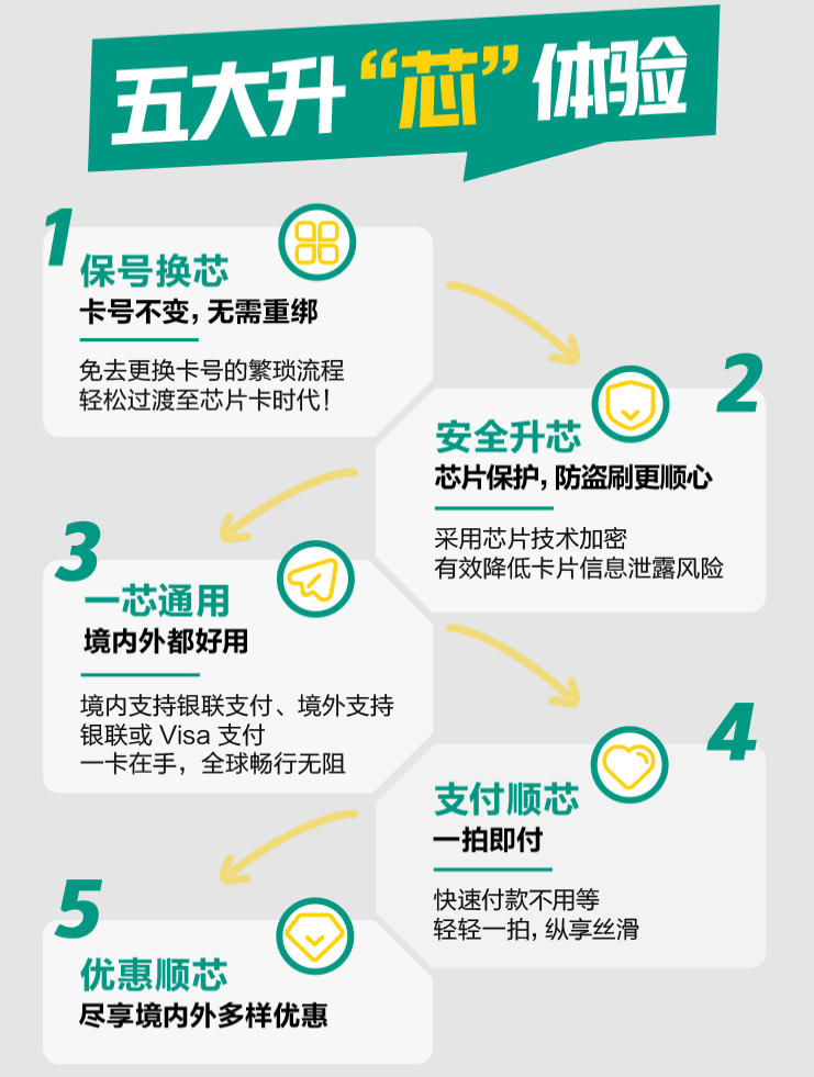 无论境内境外,现在一张芯片卡就能统统搞定!而且升级完全免费,卡号不变,所有绑定服务无缝衔接,这样的好事怎能错过呢?