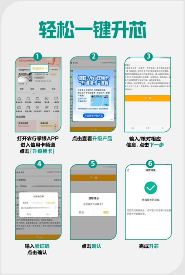 福利介绍得差不多了,那么手头有农行银联Visa双标卡的小伙伴,该如何把手中的卡片升级成芯片卡呢?很简单,跟着下面的步骤来: