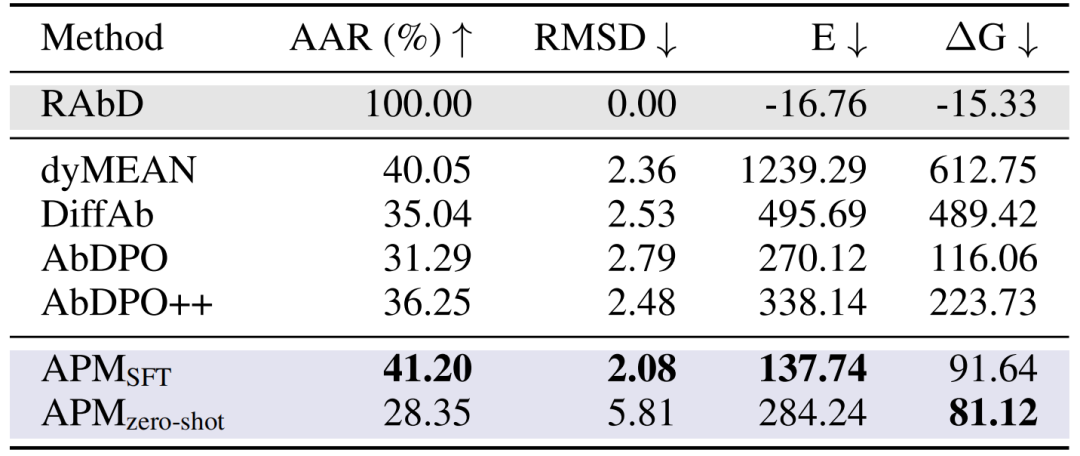 抗体 CDR-H3 设计:在 RAbD 基准测试中,APM 的 AAR 达 41.20%,RMSD 为 2.08,结合能 ΔG 为 91.64,全面超越 dyMEAN、DiffAb 等方法;零样本生成的抗体虽序列与天然差异大,但结合能更优(ΔG 81.12),证明其通用结合能力。