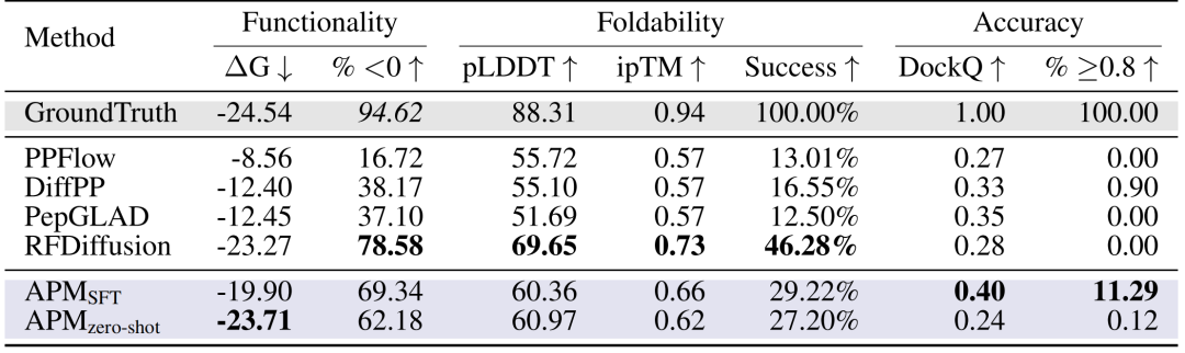 肽段设计:在 PepBench 和 LNR 数据集上,研究人员从功能性、可折叠性和准确性三个关键方面对肽设计方法进行全面评估。如下图所示,APM(SFT)的结合能 ΔG 达 -19.90,69.34% 样本 ΔG<0,DockQ≥0.8 的比例达 11.29%,远超 PPFlow、PepGLAD 等方法,且折叠稳定性(pLDDT 60.36,ipTM 0.66)优异。
