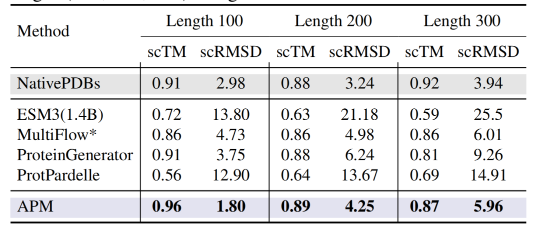 此外,如下图所示,在无条件生成的长度为 100-300 的残基蛋白中,APM 的 scTM 达 0.96(Length 100),scRMSD 低至 1.80,显著优于 ESM3(1.4B)、ProtPardelle 等全原子设计模型。