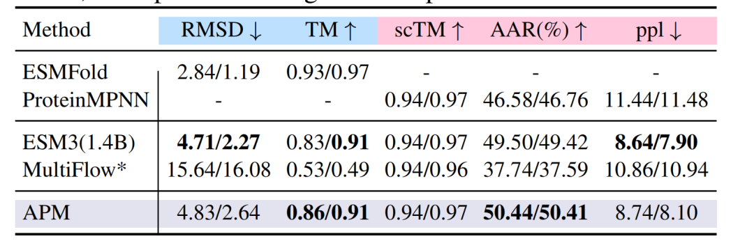 折叠任务中,在 PDB 数据集上,APM 的 RMSD 为 4.83/2.64,TM-score 达 0.86/0.91,与 ESM3、MultiFlow 等模型性能相当;逆折叠任务中,氨基酸回收率(AAR)达 50.44%,超越 ProteinMPNN 的 46.58%。