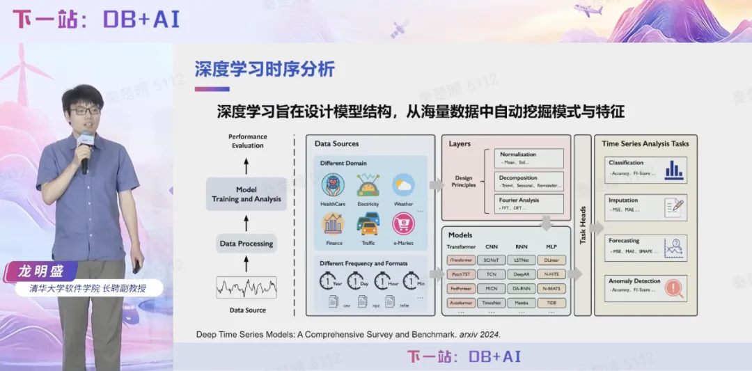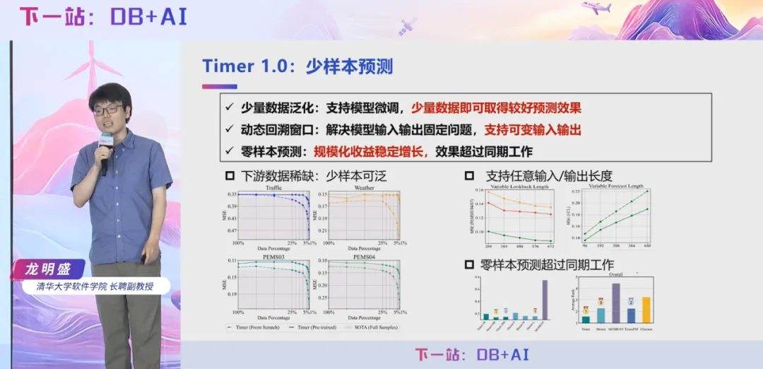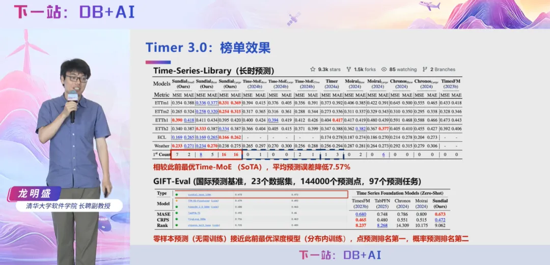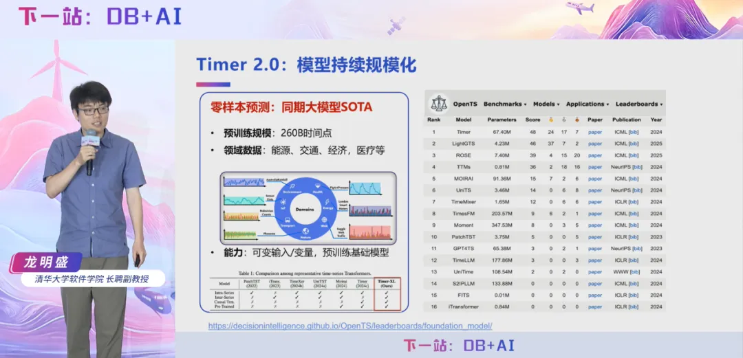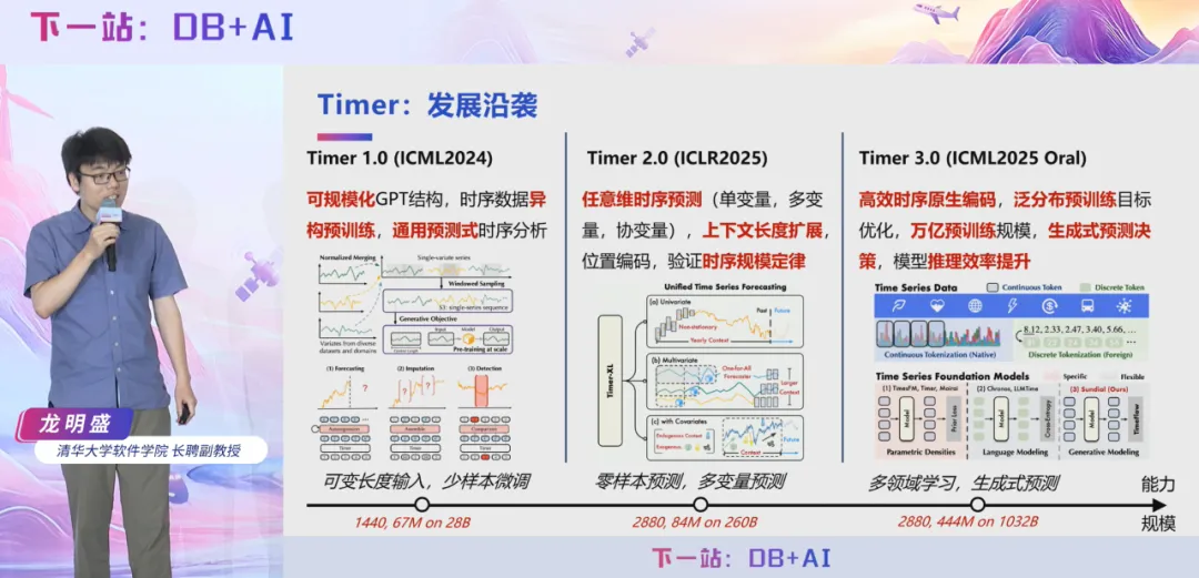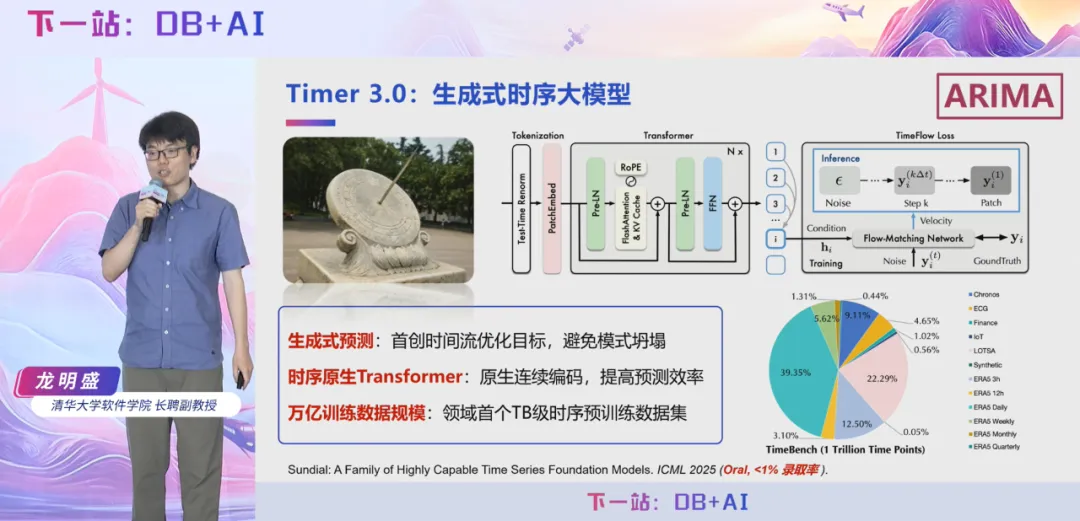 7 月 5 日,2025 时序数据库技术创新大会在北京成功举办,清华大学软件学院长聘副教授龙明盛在大会上做主题报告《Timer 3.0:新一代生成式时序大模型》,深入剖析当前时间序列分析领域面临的核心挑战,系统阐述了时序大模型的技术演进趋势与行业痛点,并重点分享清华团队自主研发的时序大模型 Timer 从 1.0 至 3.0 版本的关键技术路线、创新突破点及在多项国际基准测试中的卓越表现。
