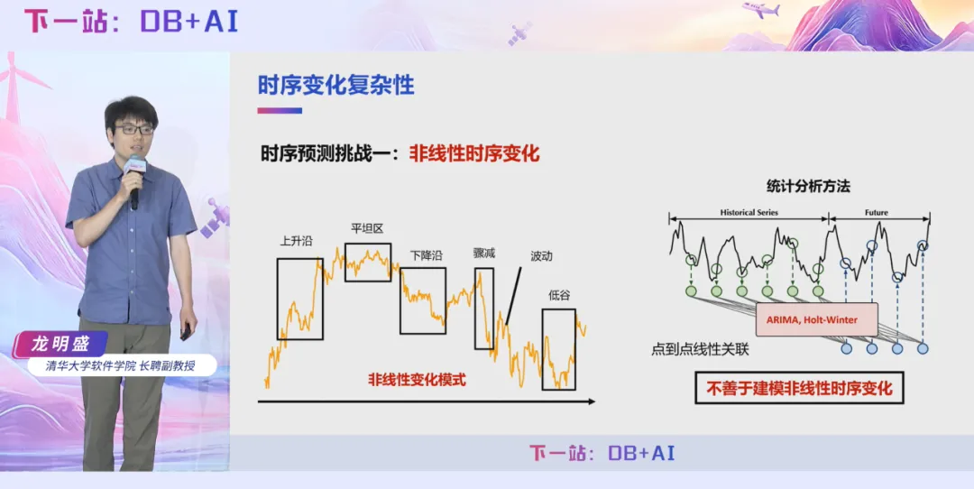 龙明盛教授认为,时间序列数据作为重要的工业资产,其分析面临三大核心难题:第一,数据变化呈现非线性特征,传统线性建模工具,如 ARIMA、Holt-Winters 存在理论局限,无法适配时序数据变化趋势。