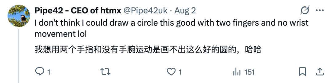 当我还在疑惑「画圆」超越人类能力的点在哪的时候,网友的评论已经揭示了答案:原来人在画圆的时候需要手腕运动…
