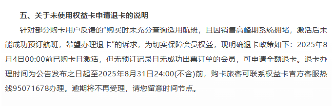 回复关于[退卡政策]的疑问:“那如果我激活了,也订了票但没成功出票(比如航班取消),或者只用了里面几段但剩下用不上了,这种还能退吗?感觉这政策还是挺严格的,你们怎么看?” 从公告的字面意思理解,“无预订记录且无成功出票订单”是两个并列条件,必须同时满足。这意味着,只要你的会员卡产生了任何形式的预订记录,无论该预订后来是否成功出票或最终取消,都可能不符合退卡条件。这确实为那些“用了几段但剩下用不上”或因航司原因导致预订取消的用户设置了障碍,显得相对严格而非完全开放。其目的可能是为了限制退卡范围,避免二次纠纷,同时控制企业损失。