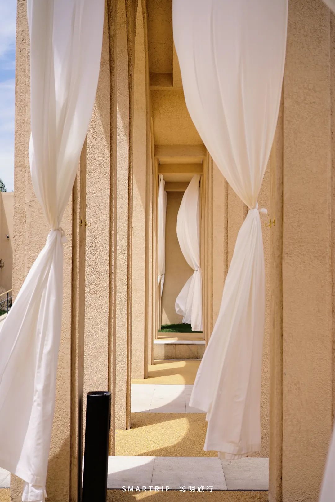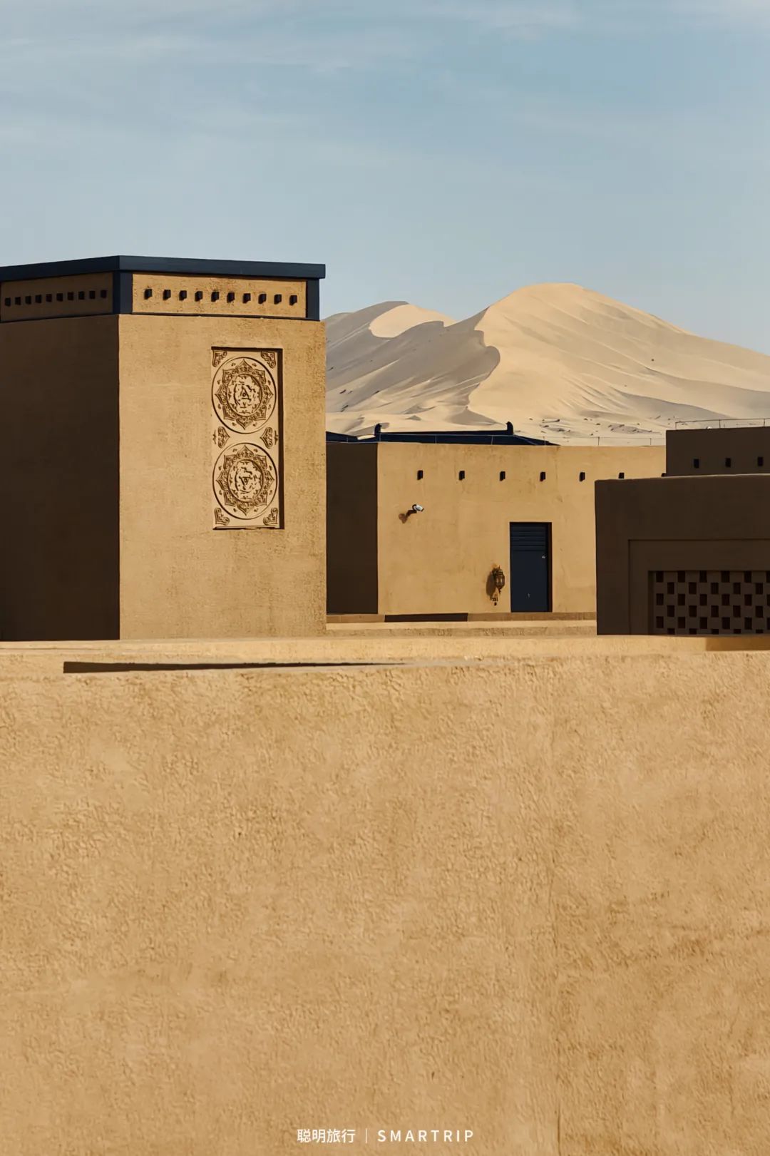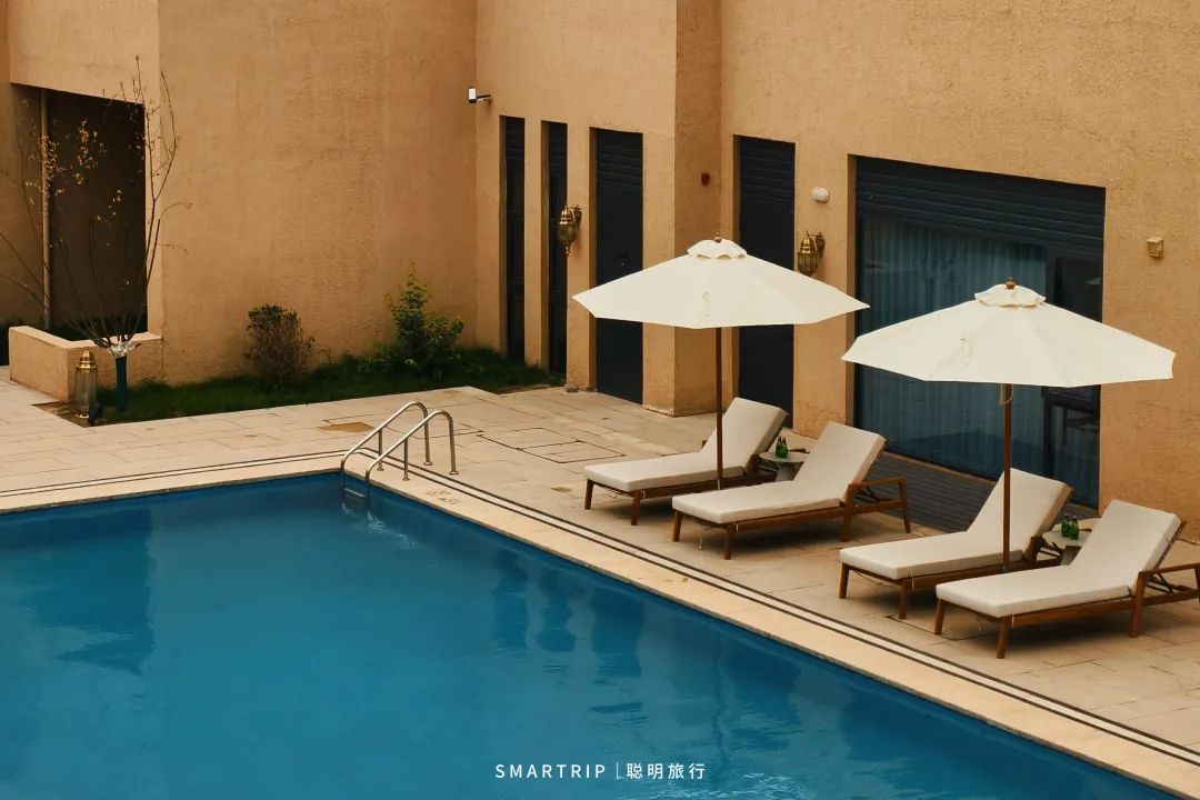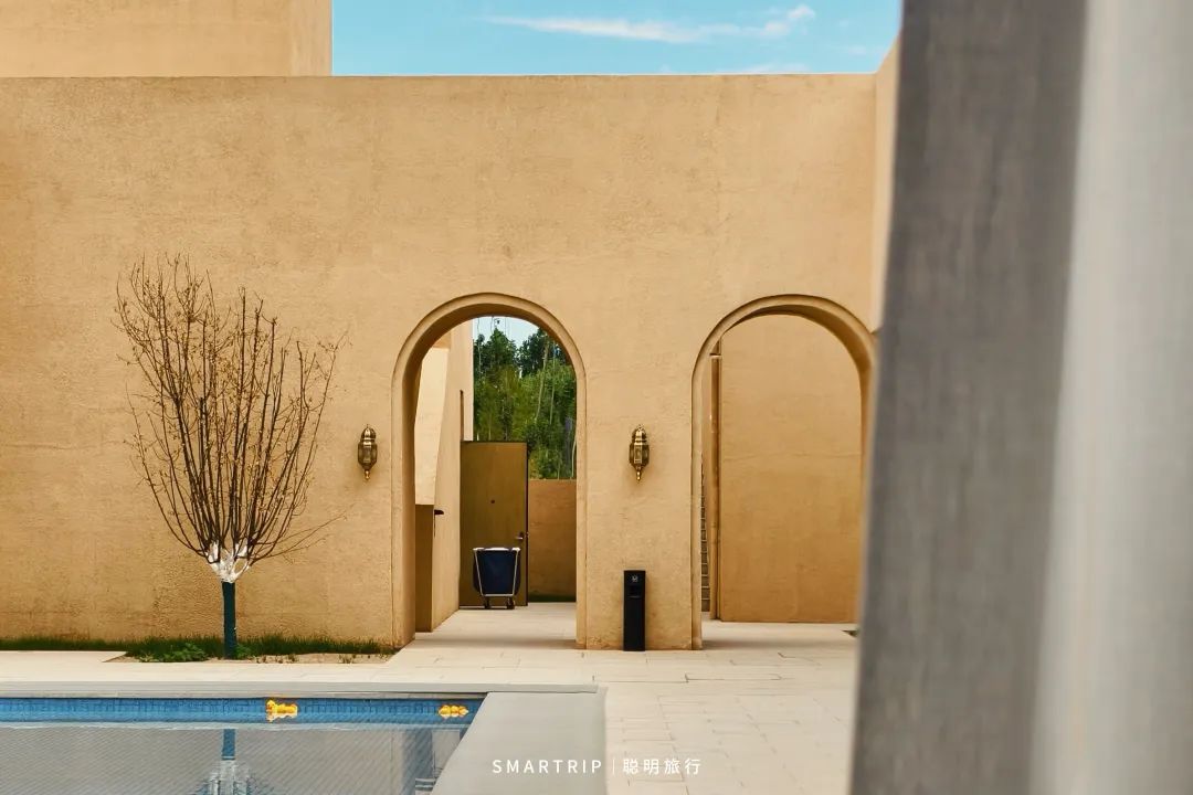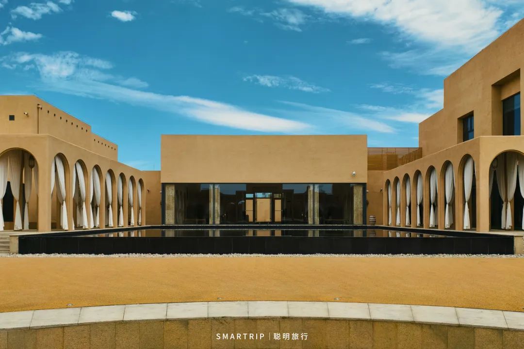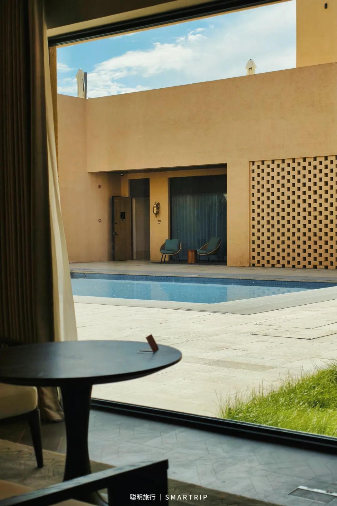 酒店共有69间客房,分布在5个两层院落中,每间客房面积45平方米起,装饰融入“驼铃”、“飞天”等丝路符号,并配备高品质卫浴设施,如汉斯格雅、TOTO卫洗丽和戴森吹风机。值得一提的是,酒店的欢迎礼和迷你吧也体现了细致入微的服务。此外,每个院落都设有水景,包括戏水池和泳池,在沙漠中营造出绿洲般的度假体验。