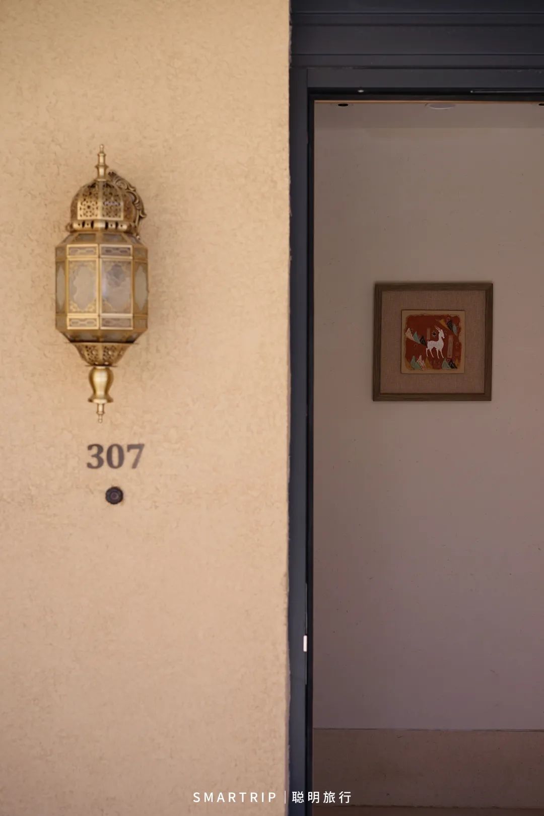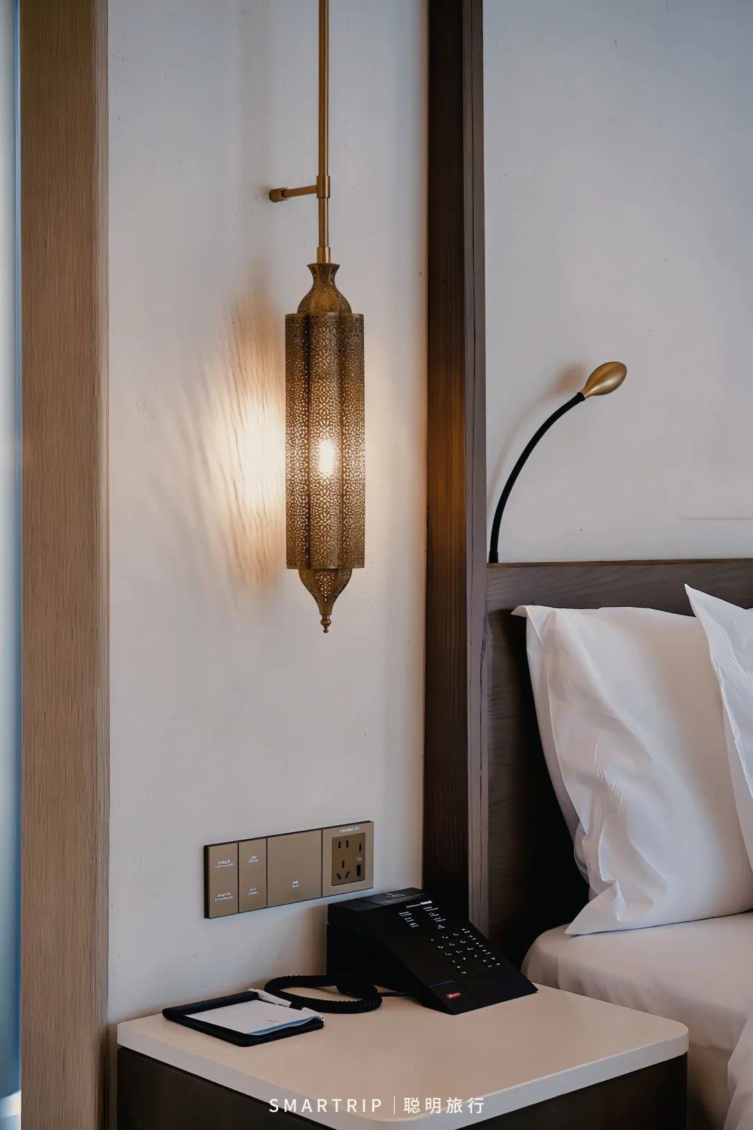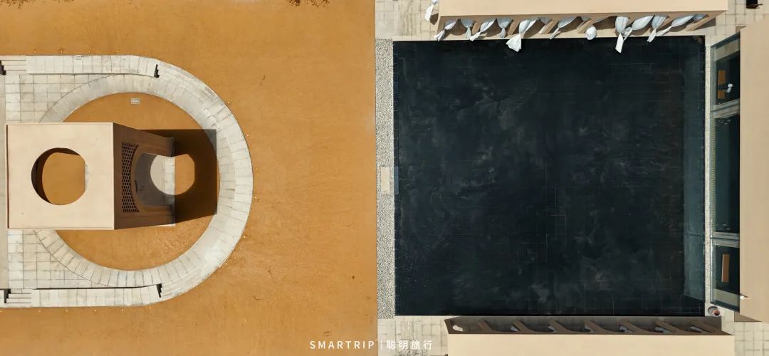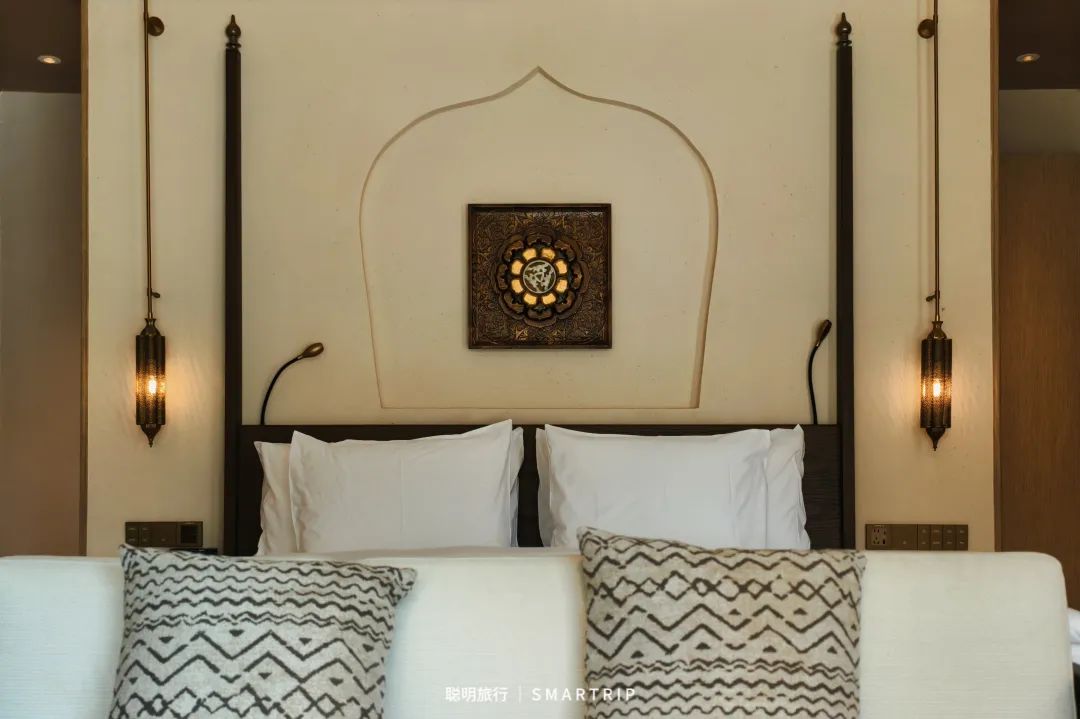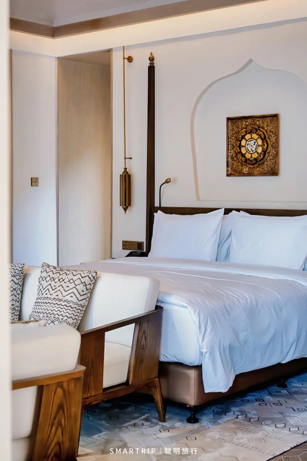 酒店共有69间客房,分布在5个两层院落中,每间客房面积45平方米起,装饰融入“驼铃”、“飞天”等丝路符号,并配备高品质卫浴设施,如汉斯格雅、TOTO卫洗丽和戴森吹风机。值得一提的是,酒店的欢迎礼和迷你吧也体现了细致入微的服务。此外,每个院落都设有水景,包括戏水池和泳池,在沙漠中营造出绿洲般的度假体验。