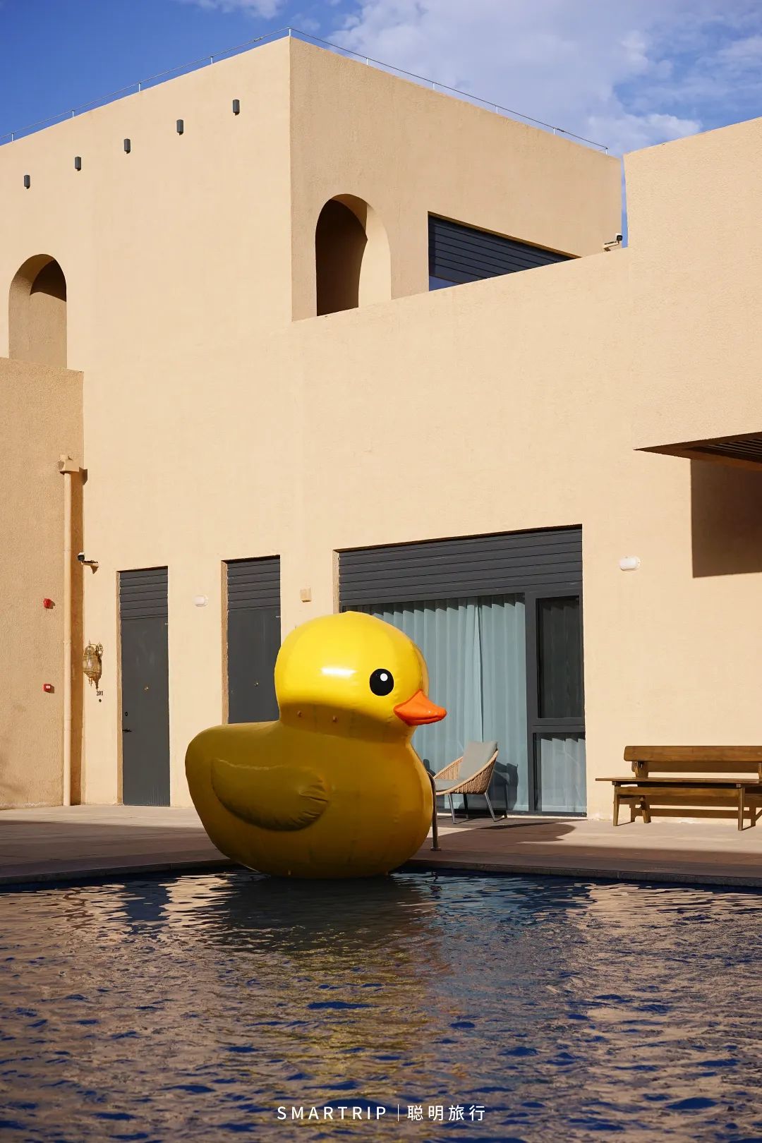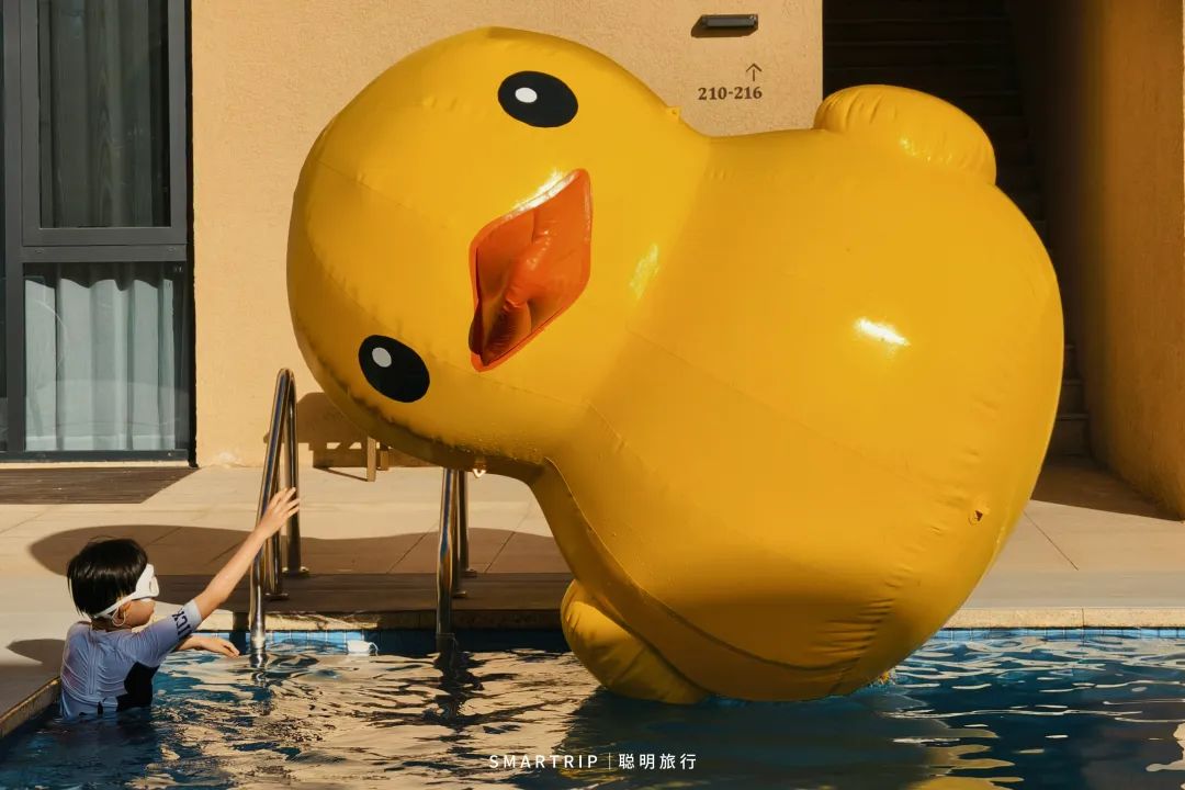 大黄鸭不定期闪现泳池,同时提供水枪,在沙漠里也能快乐玩水。