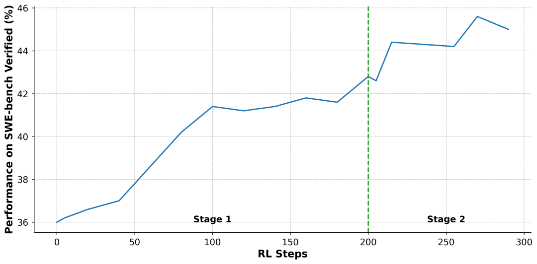 图 3: 两阶段强化学习过程中的性能提升曲线。第一阶段(0-200 步)显示了在完整数据集上训练的稳定提升。第二阶段(200 步之后)则是在过滤后更具挑战性的数据集上继续训练,带来了进一步的性能增益。
