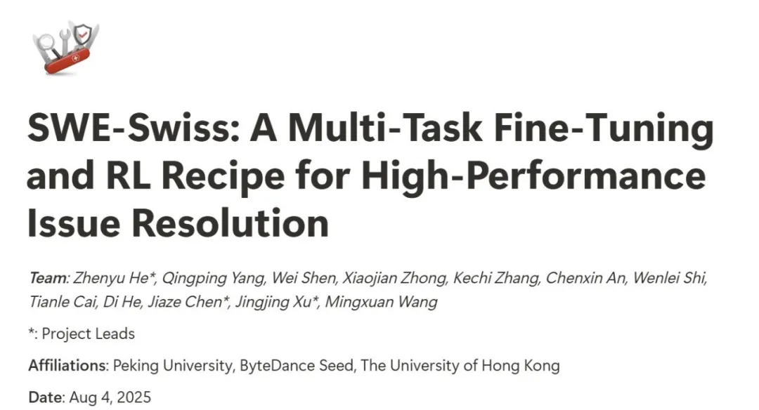 原文标题:北大、字节跳动联手发布SWE-Swiss:一把修复代码Bug的「瑞士军刀」,完整配方直指开源SOTA