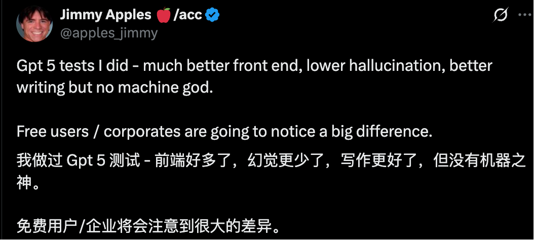 也有人表示,GPT-5在前端体验、减少幻觉和提升写作质量方面有显著改进,免费用户和企业用户将感受到明显的提升。