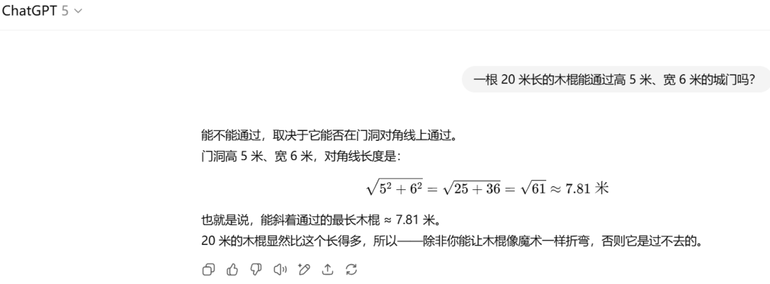而对于那道经典的「木棍过城门」的推理题,GPT-5 依然搞不定。