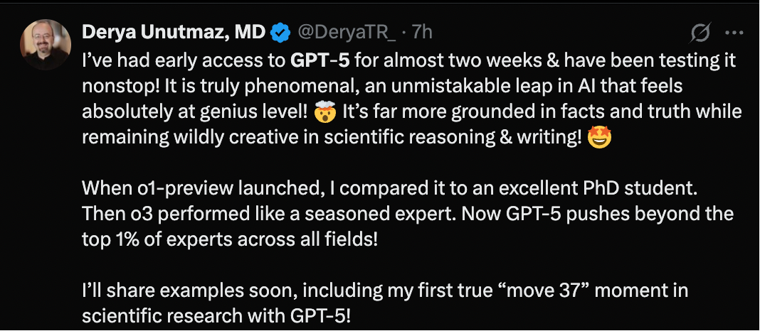 有人表示,提前体验 GPT-5 将近两周,发现它展现了巨大的进步,超越了之前的版本,并且在科学推理、事实准确性和创意表达方面达到了新的高度。