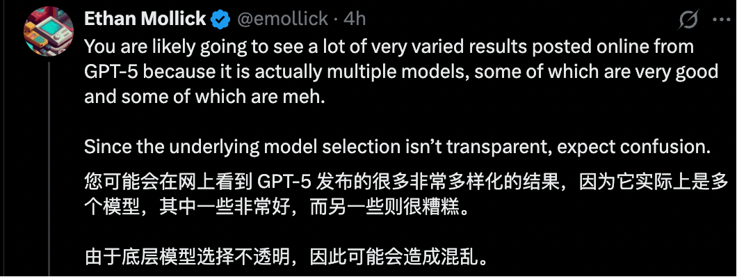 宾夕法尼亚大学沃顿商学院教授 Ethan Mollick 认为,由于 GPT-5 是个集成模型,其中一些模型表现优异,而另一些则较为平庸。 OpenAI 并未公开底层模型选择的细节,这种不透明性可能导致用户对 GPT-5 的表现感到困惑。