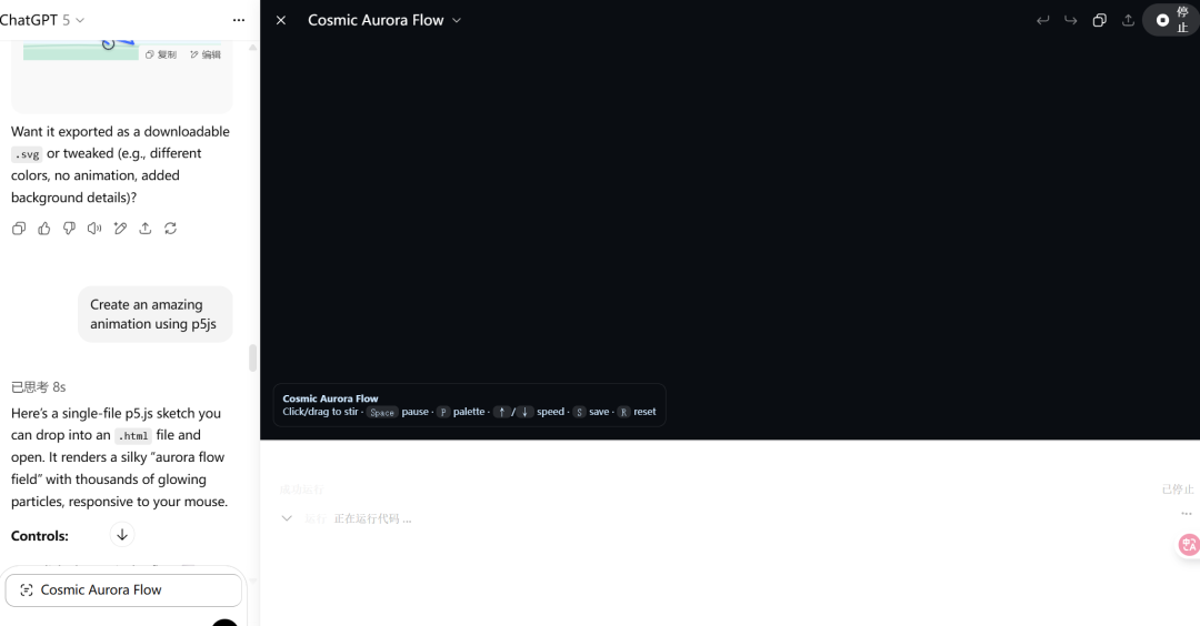 我们又让它使用 p5.js 创建一个精彩的动画,GPT-5 直接罢工了,输出一个黑屏界面。