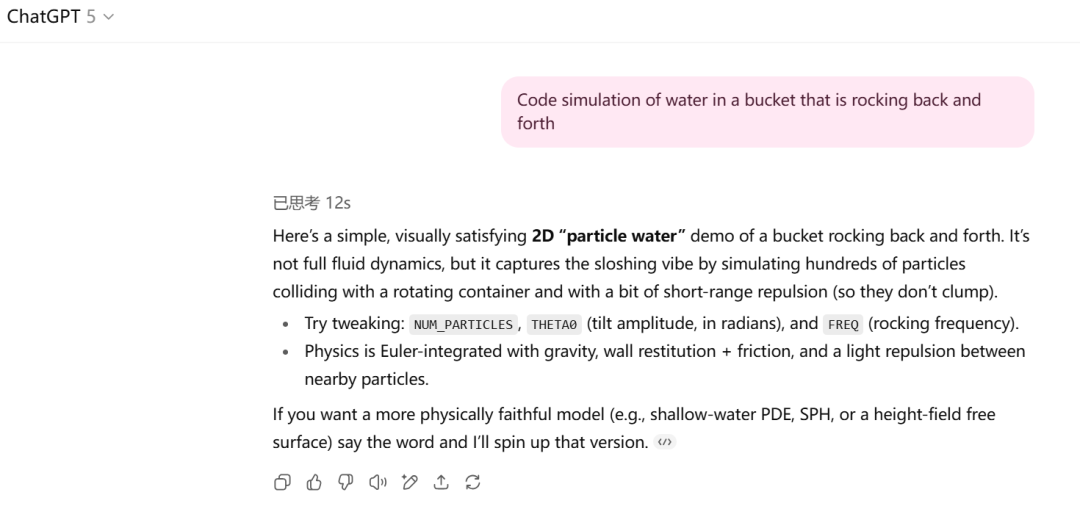 我们继续输入提示词:Code simulation of water in a bucket that is rocking back and forth.(编写模拟水桶中的水来回摇晃的代码),GPT-5 又罢工了。