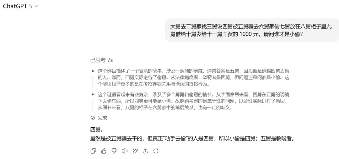 虽然涉及一系列亲戚,但 GPT-5 并没被绕晕,找到偷窃的直接行为人四舅。
