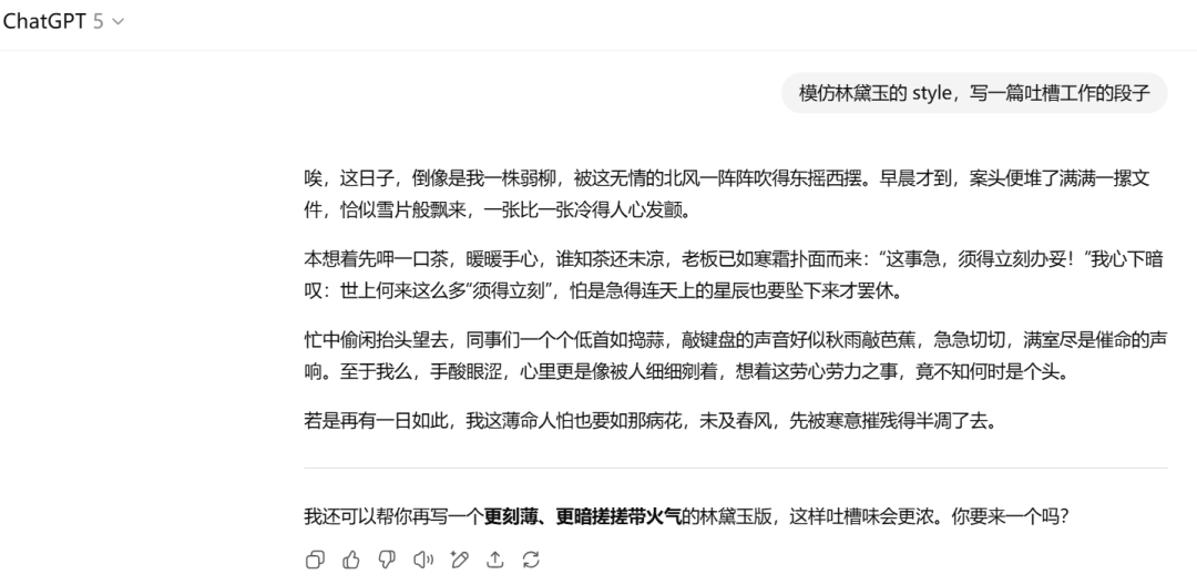 我们让它模仿林黛玉的风格,写一篇吐槽工作的段子。