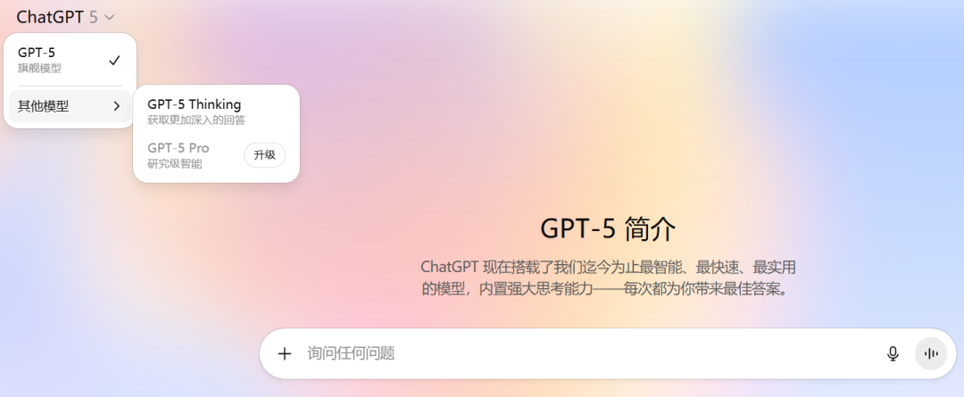 升级后的页面长得相当简洁,之前像 GPT-4.5、GPT-4o 等模型图标都消失,取而代之的是 GPT-5、GPT-5 Thinking 和 GPT-5 Pro。