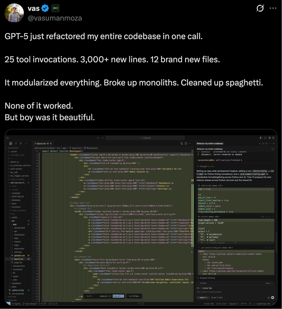 还有网友使用 GPT-5 重构代码库,尽管代码看起来非常漂亮、整洁,但最终并没有成功运行。