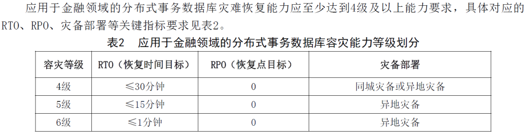 另外在JR/T 0205-2020 《分布式数据库技术金融应用规范 灾难恢复要求》中给出了金融领域分布式数据库的容灾能力级别以及对应的RPO和RTO要求。
