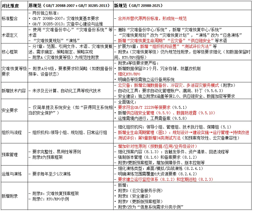 《网络安全技术 信息系统灾难恢复规范》GB/T 20988-2025确立了信息系统灾难恢复工作原则,给出了信息系统灾难恢复生命周期,规定了信息系统灾难恢复应遵循的基本要求,描述了灾难恢复能力等级划分和测试评价方法。作为替代GB/T 20988-2007《信息安全技术 信息系统灾难恢复规范》和GB/T 30285-2013《信息安全技术 灾备恢复中心建设与运维管理规范》,其中有以下不同地方,如下表所示: