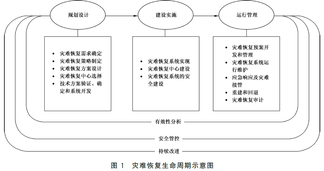 为实现该目标定义了灾难恢复的生命周期管理,包括规划设计、建设实施和日常运行管理,包括预案管理、运行维护、监控、巡检工作,还涉及应急响应及灾难接管、重建和回退、审计等相关工作。