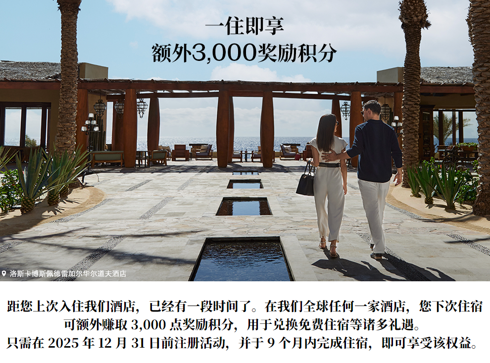 2. **3000额外积分**:同样提供两个注册链接,要求会员在2025年12月31日前注册,并在注册后的4个月或9个月内完成一次住宿。完成一次住宿后,即可获得额外的3000积分 bonus,对于低消费的入住更有吸引力。