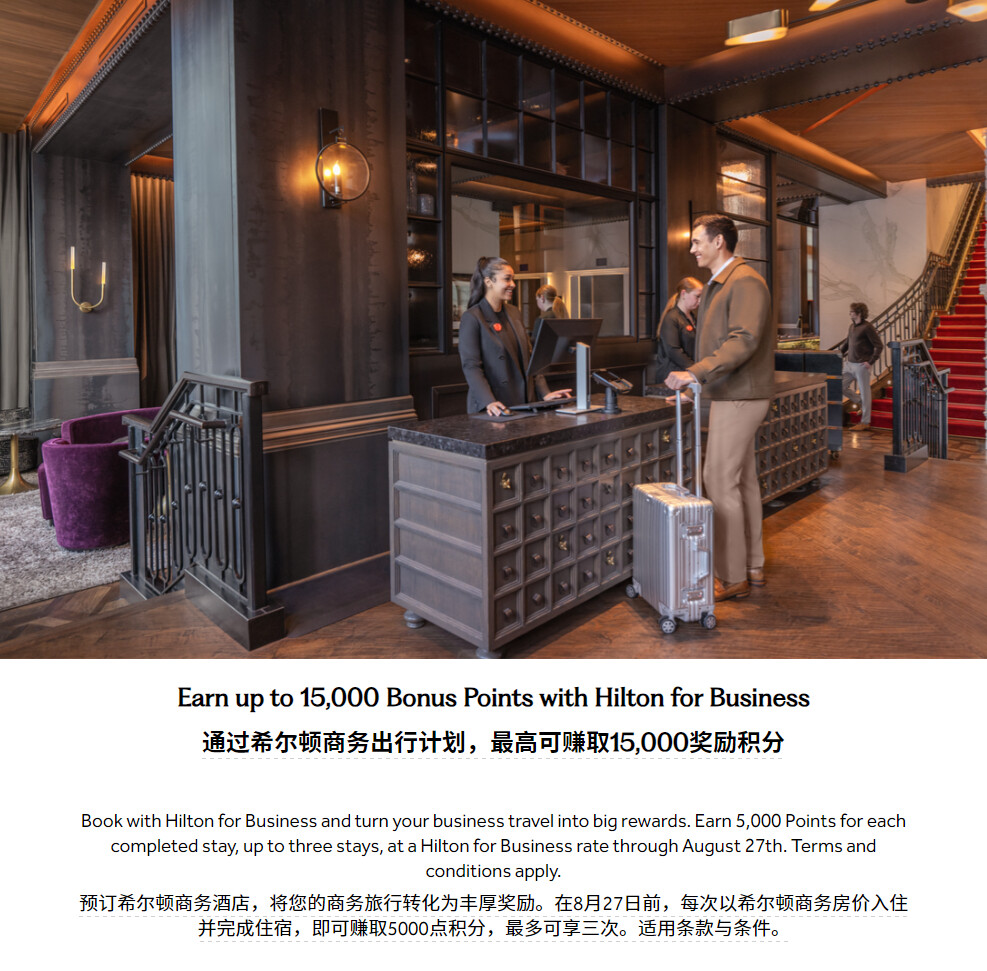 1. **商务出行15000积分**:此项福利专属希尔顿商务出行计划成员。在2025年8月27日前注册并入住,每次入住可获5000积分,最多可享三次,总计15000积分。若不具备资格,文章建议可通过特定渠道获取邀请。