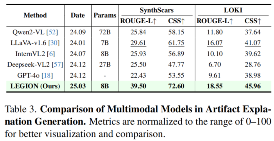 LEGION 仅用 8B 参数量就能够在异常解释任务中打败其他同等甚至更大规模的模型。作者还指出诸如 Deepseek-VL2/GPT-4o 这样的模型会输出看似全面的各种可能性,但实际上会导致答案冗杂,评分偏低。