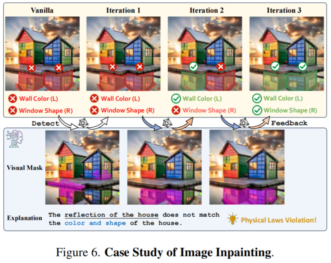上例中,原始生成图像的伪影较为隐蔽,乍一眼看去往往会被忽略 —— 房子在水中的倒影与实际的颜色和形状不一致,这是典型的物理定律违反。通过多轮对伪影区域的局部修正,能够逐步得到更高质量、更逼真的合成图片。
