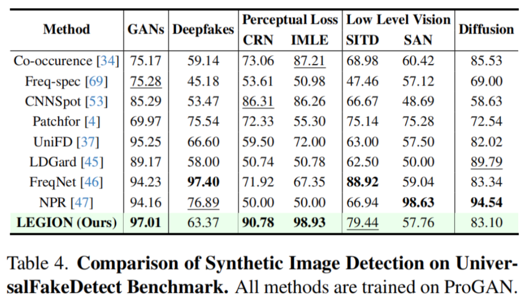伪造检测任务选择在 UniversalFakeDetect 基准上进行测试: