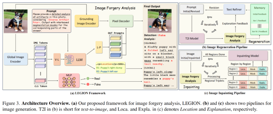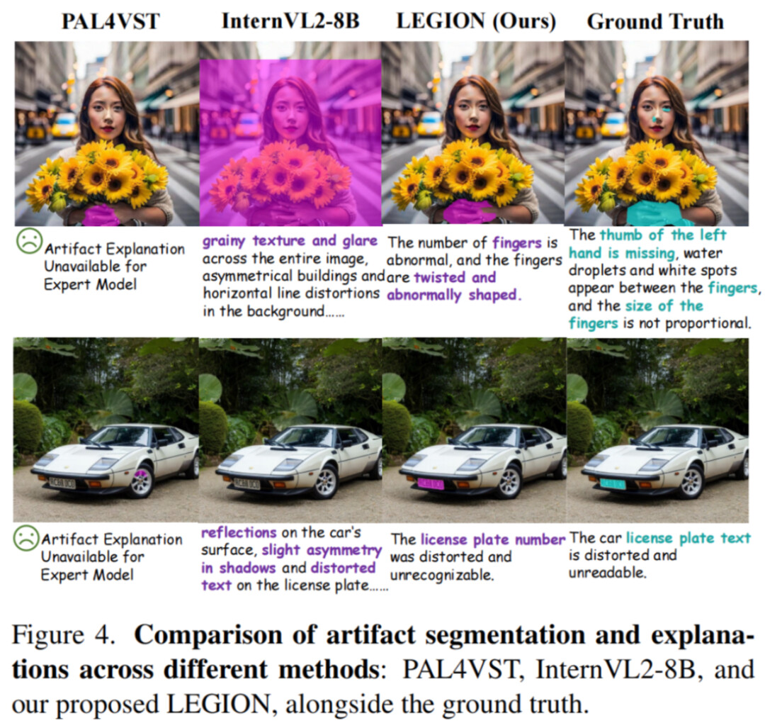 与传统专家模型仅给出真伪判断不同,LEGION 除此以外还利用视觉掩码直击 “造假部位”,语言能力生成 “打假报告” → 不只判真假,更说清何处假、为何假、有多假!