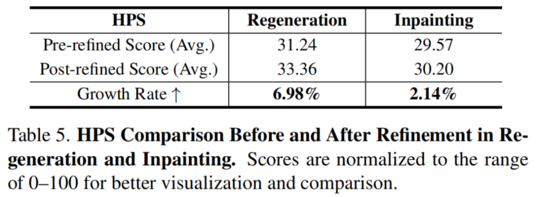 此外,我们利用 HPSv2.1 模型对应用上述两种方法前后生成的图像进行了定量的人类偏好评分,能够明显发现在引导图像优化后有较大程度的提升,这说明了用 "打假" 反哺 "造真" 的可行性和有效性。