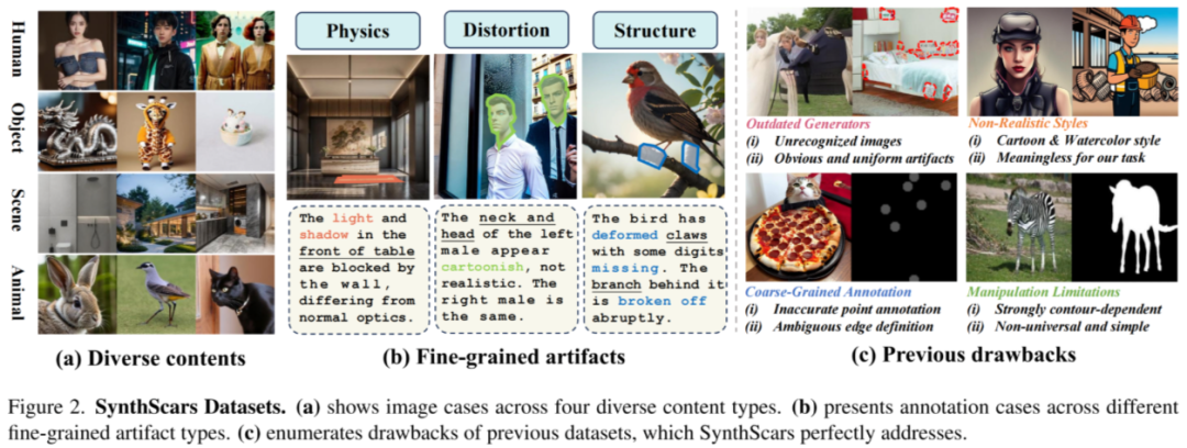 该团队反思了现有伪造图像数据集的局限性,并且构建了首个针对纯 AI 合成图像,可进行全面伪造分析的数据集 SynthScars,直击现有顶级生成技术的缺陷与 “伤疤”,让看似完美的 AI 图像显露真容,为图像安全研究注入新动力,主要具有以下亮点: