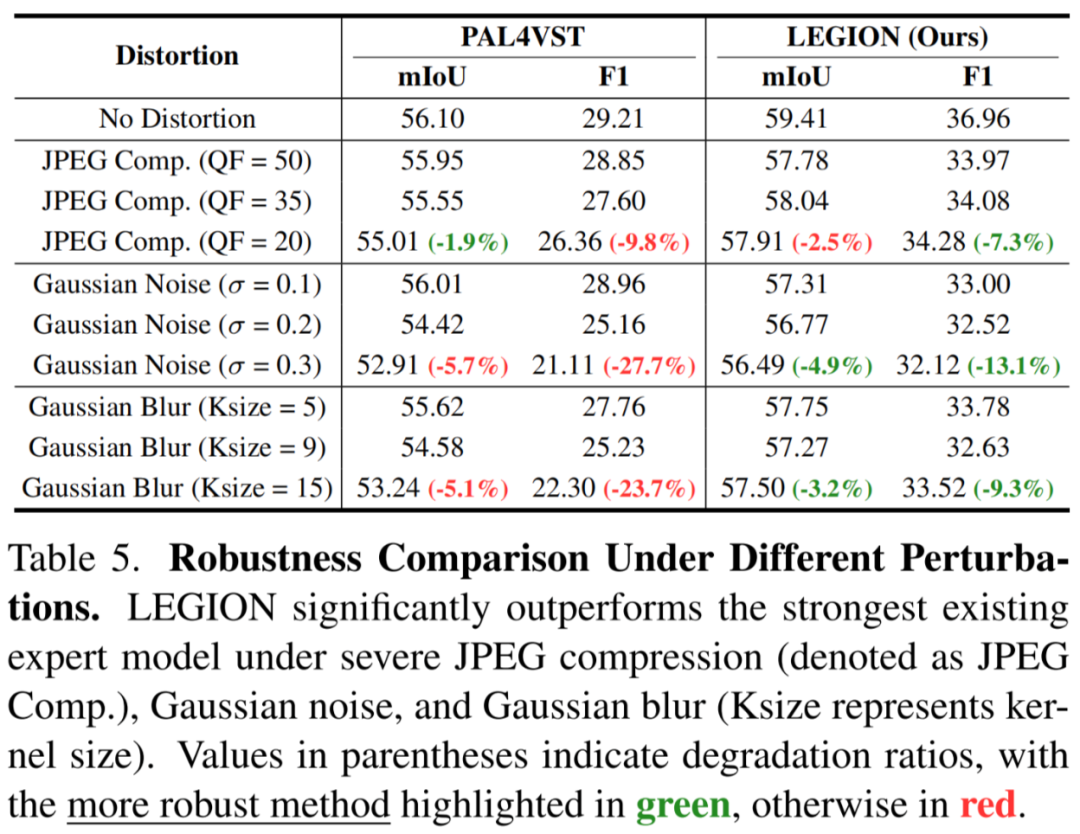 作者尝试了高斯噪声攻击、JPEG 压缩失真和高斯模糊三种干扰处理,发现 LEGION 性能相较于传统专家模型而言波动较小,具有更强的鲁棒性: