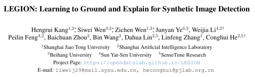 那么我们该如何破局?在 ICCV25 highlight paper《LEGION: Learning to Ground and Explain for Synthetic Image Detection》中,来自上海交通大学、 上海人工智能实验室等组织的研究团队从构建高质量 AI 合成图像数据集、设计可解释伪造分析模型、实现检测与生成的对立统一这三个角度给出了他们的答案。